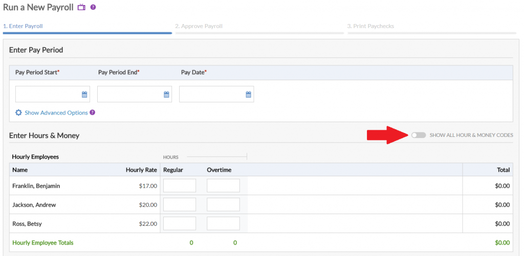 Payroll customers can now filter their frequently used hours and money codes on their payroll entry page. If you need to use more hour or money codes, you can flip a switch to view all of your codes. This will keep your payroll entry page cleaner. You can manage frequently used codes in your Payroll Settings.