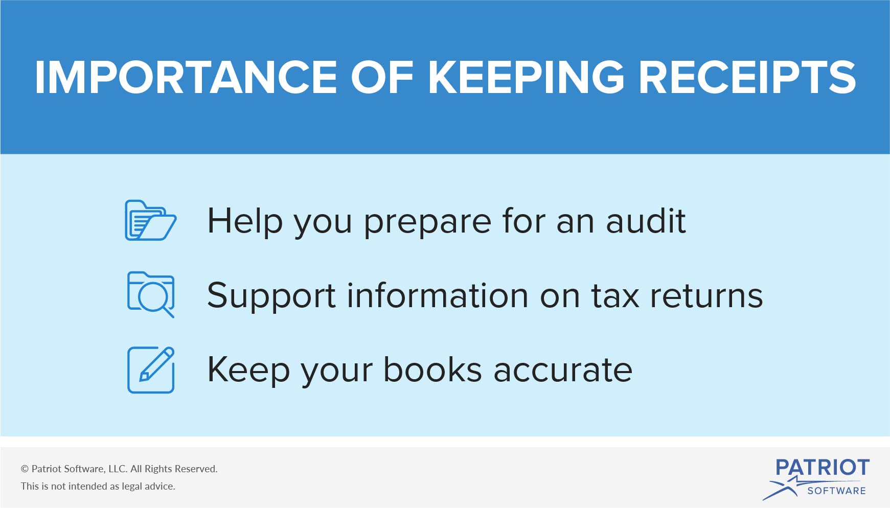 Business receipts can also help keep your books accurate. The fewer receipts you keep, the more likely your accounting books will be off. To keep your books correct, record receipts regularly. Add receipt information in your books as soon as possible for an accurate financial snapshot of your business.