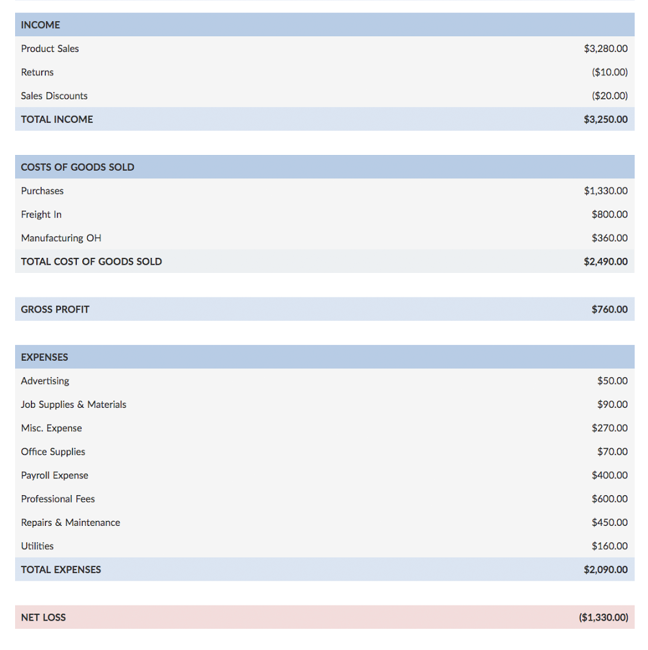 总收入、销货成本、总收入、费用、税收和净收入都是损益表上的分项。净收入是报表的最后一行,这就是为什么它也被称为底线。