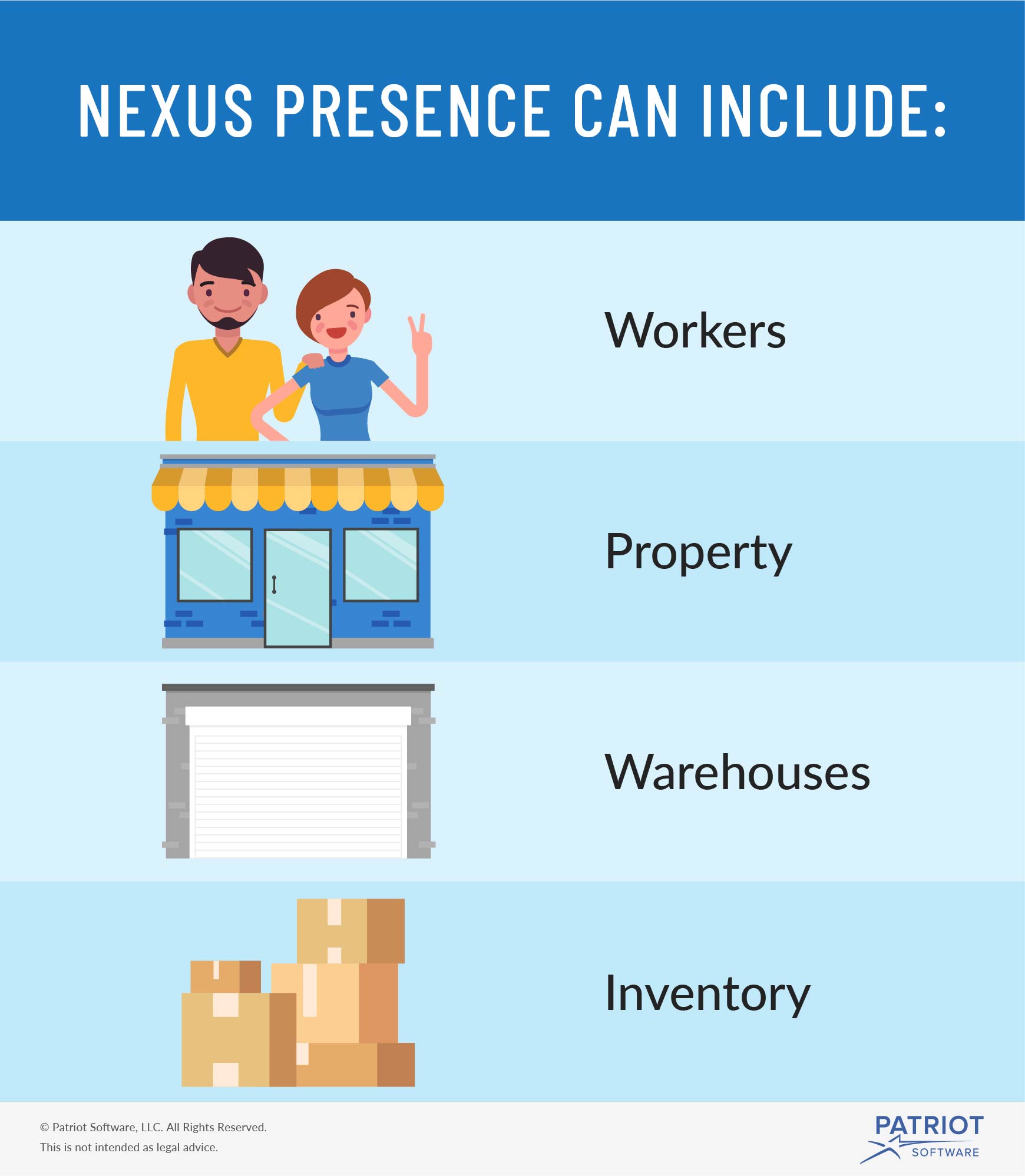 Sales tax nexus determines whether a business has a significant presence in an area to collect sales tax. Nexus presence includes your business, employees, warehouses, and inventory. Sales tax nexus requires companies doing business in a state to collect and pay sales tax in that specific state. For example, if you sell goods or services in Boston, you must file and pay Massachusetts sales taxes.