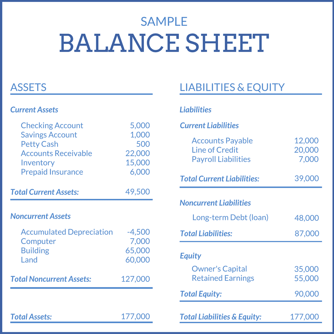 Thebalance sheetis split into three parts: assets, liabilities, andowner’s equity. The assets section shows you the items of value that your business owns. The liabilities section shows you what you owe. And, the equity section shows you the money you have left over after paying debts.