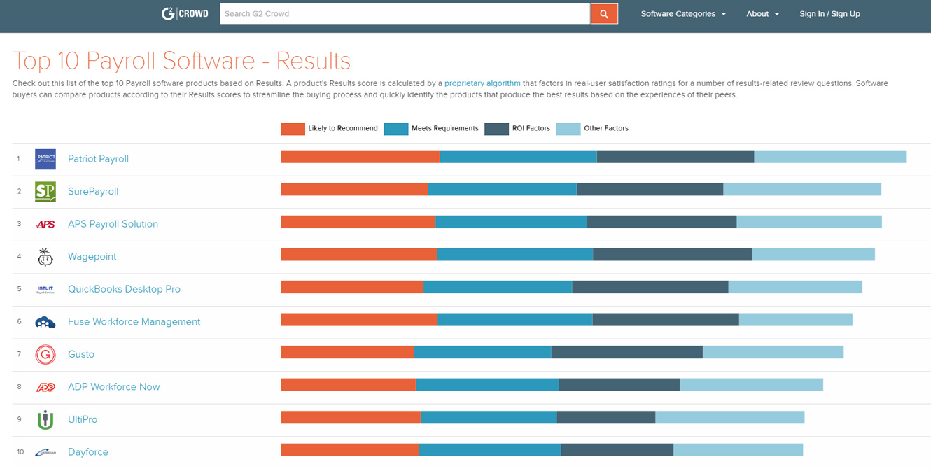 顶部10 Payroll Software list ranks Patriot’s payroll software as the number one payroll solution. This list takes into account whether the user is likely to recommend the software and if the software meets the user’s requirements. Patriot scored the highest in both of these categories. G2 Crowd also reviewed return on investment (ROI) and other factors when ranking software solutions.